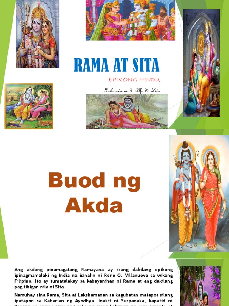 Rama At Sita Buod. Buod - Nakatira ang mag-asawang Rama at Sita kasama si Lakshamanan sa gubat noong ipinatapon sila mula sa kaharian ng Ayodha. Sinagip ni Rama si Sita mula kanila Ravana at nagapi nila ito sa tulong ng mga unggoy at isang agilang nakakita sa karuwahe ni Ravana.
